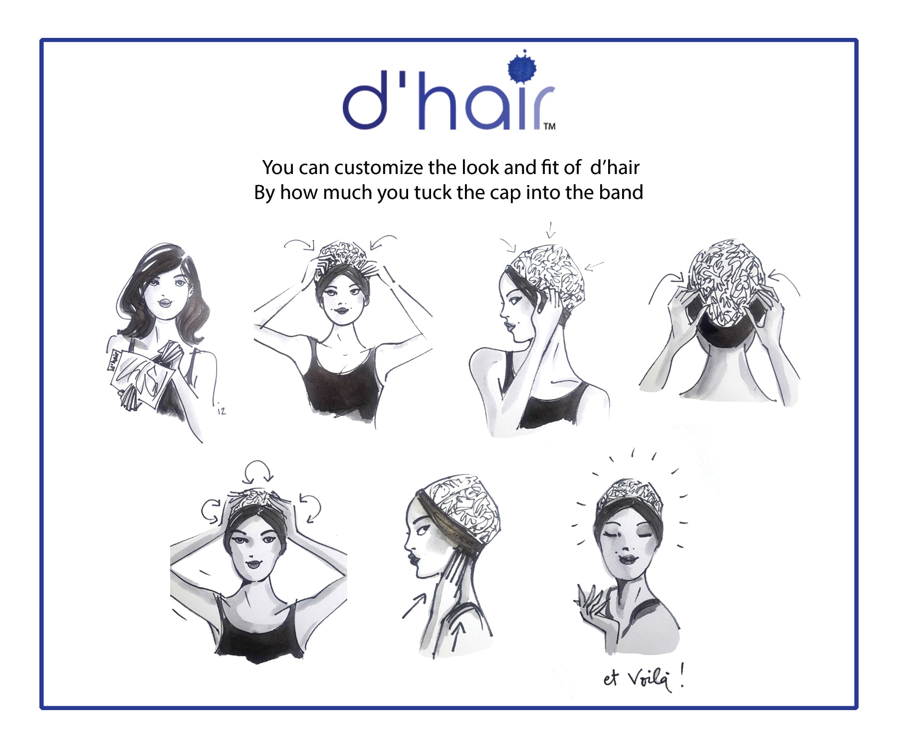 Our helpful illustrations give you some tips for comfort and style, and we encourage you to customize this no-tie water-resistant hair turban in whatever way feels right!
