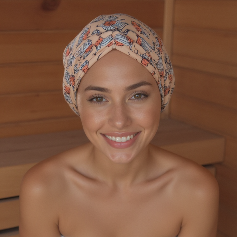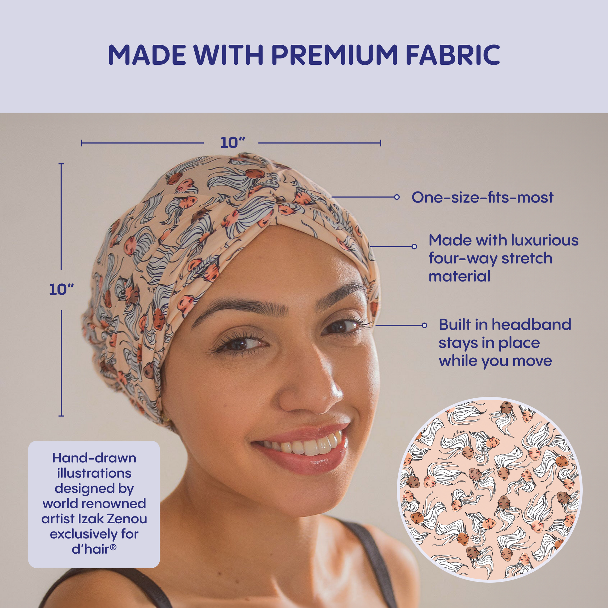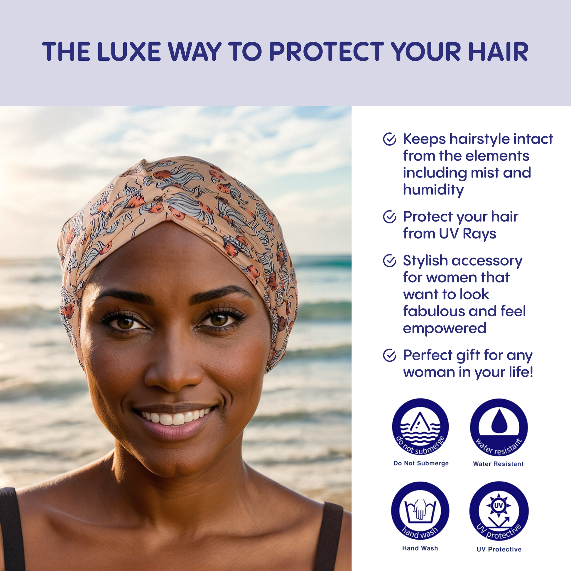Relax at the spa, sauna or hot tub, protect your bedding while doing an overnight hair mask, keep your hairstyle intact on a humid day, elevate your beach style while protecting your hair from UV rays, and look fabulous poolside in one of five exclusive prints.